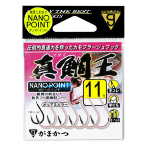 ¥300〜¥400超大型真鯛にもビクともしない「軸太」設計。大きなフトコロが真鯛の口元をしっかり捕らえます。刺し餌の姿勢も抜群に良い「軸長」鈎形状。 -