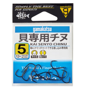 ¥250「合わせ目」に刺し込みやすい!筏の「丸貝専用鈎」です筏のチヌ釣りの「丸貝専用鈎」です。鈎先の「テーパー平打ち」加工により貝の「合わせ目」に刺し込みやすく、またチモトのすぐ下にも「タタキ」を入れ、貝の合わせ目がピッタリ合うようにしました。鈎の特性を生かすため、チモトが短か目の設計になっております。このためハリスの巻きは5~6回程度までとなりますが、強度は充分に得られます。