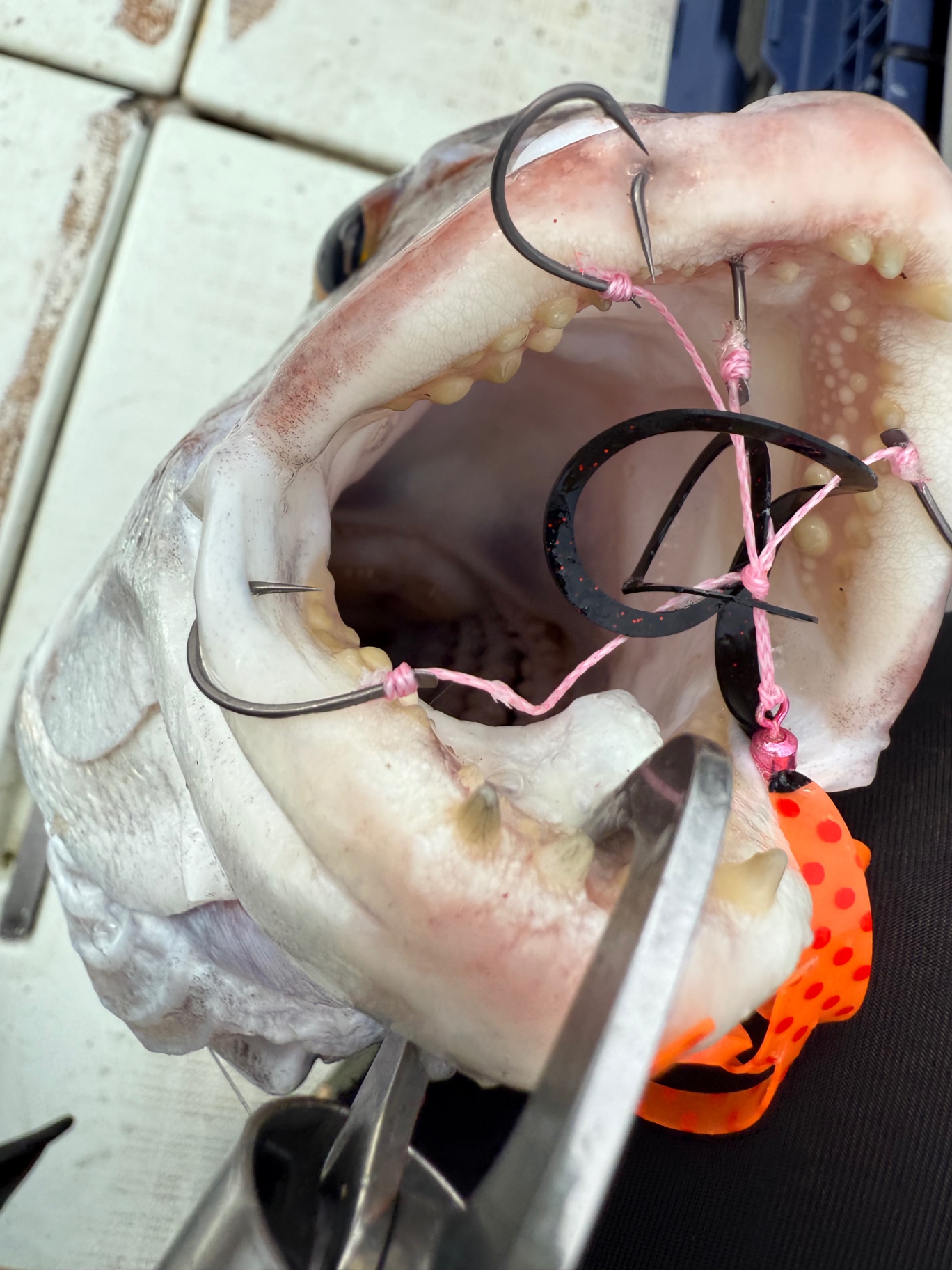 桜幻カスタムフックの4本鈎を使用しましたが、口元を見てみるとガッチガチに貫通し4本中3本がフッキング。こりゃバレませんね!