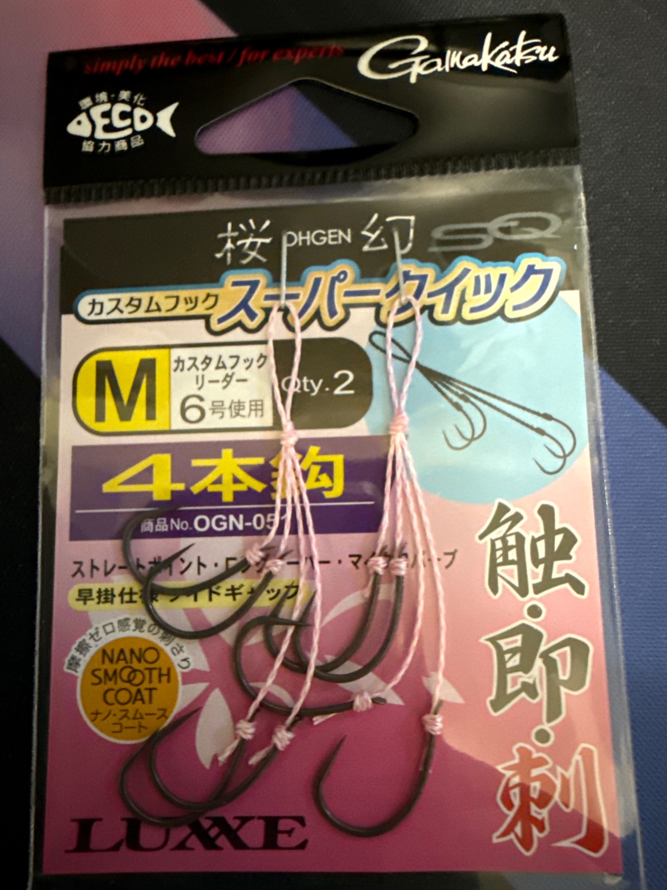 桜幻カスタムフックはショートシャンクでコンタクト性能を重視したフック形状。活性が高いときはもちろん、ショートバイトも絡め取ることのできる4本鈎でキャッチ率UP間違いなしですね!