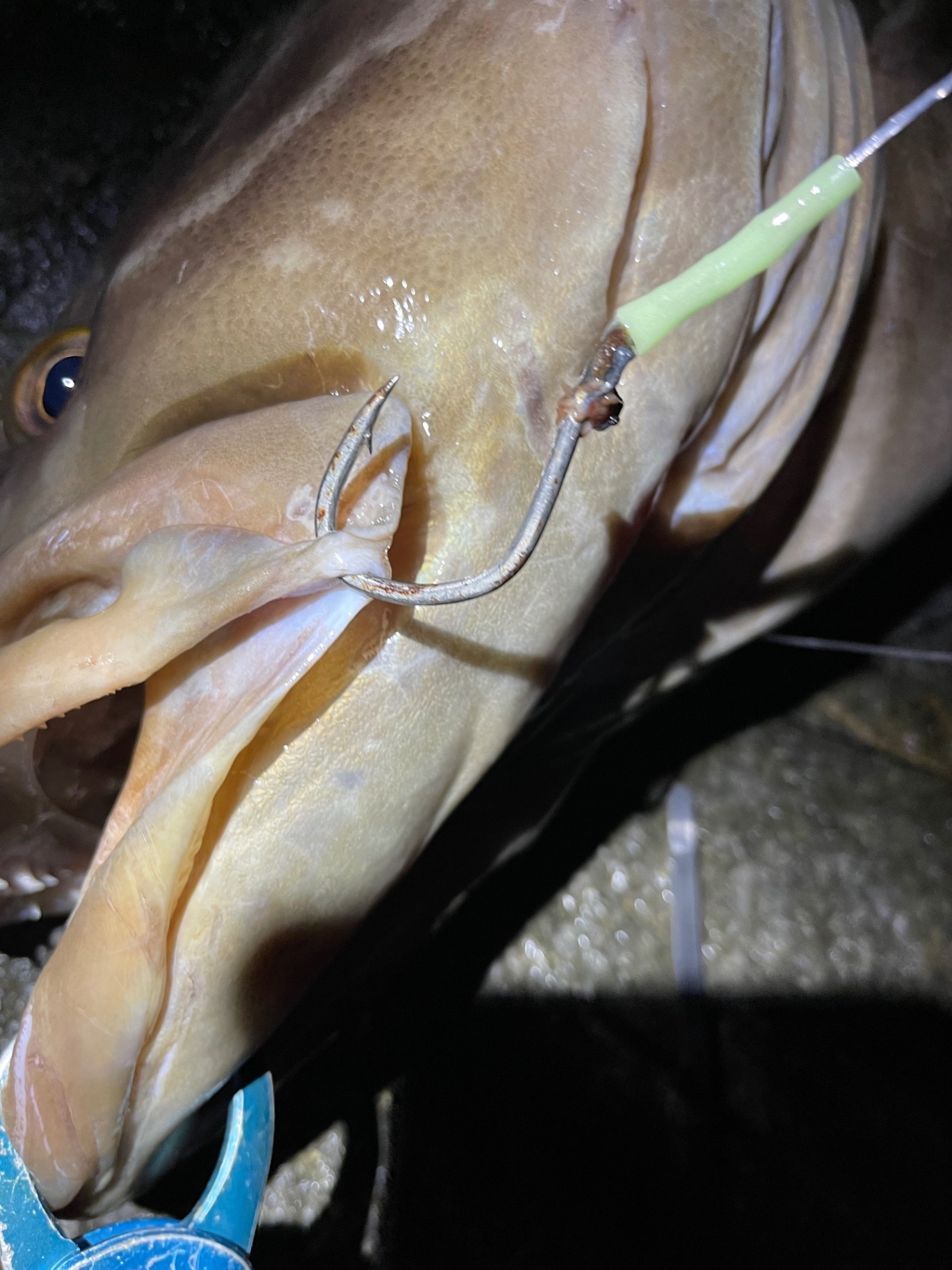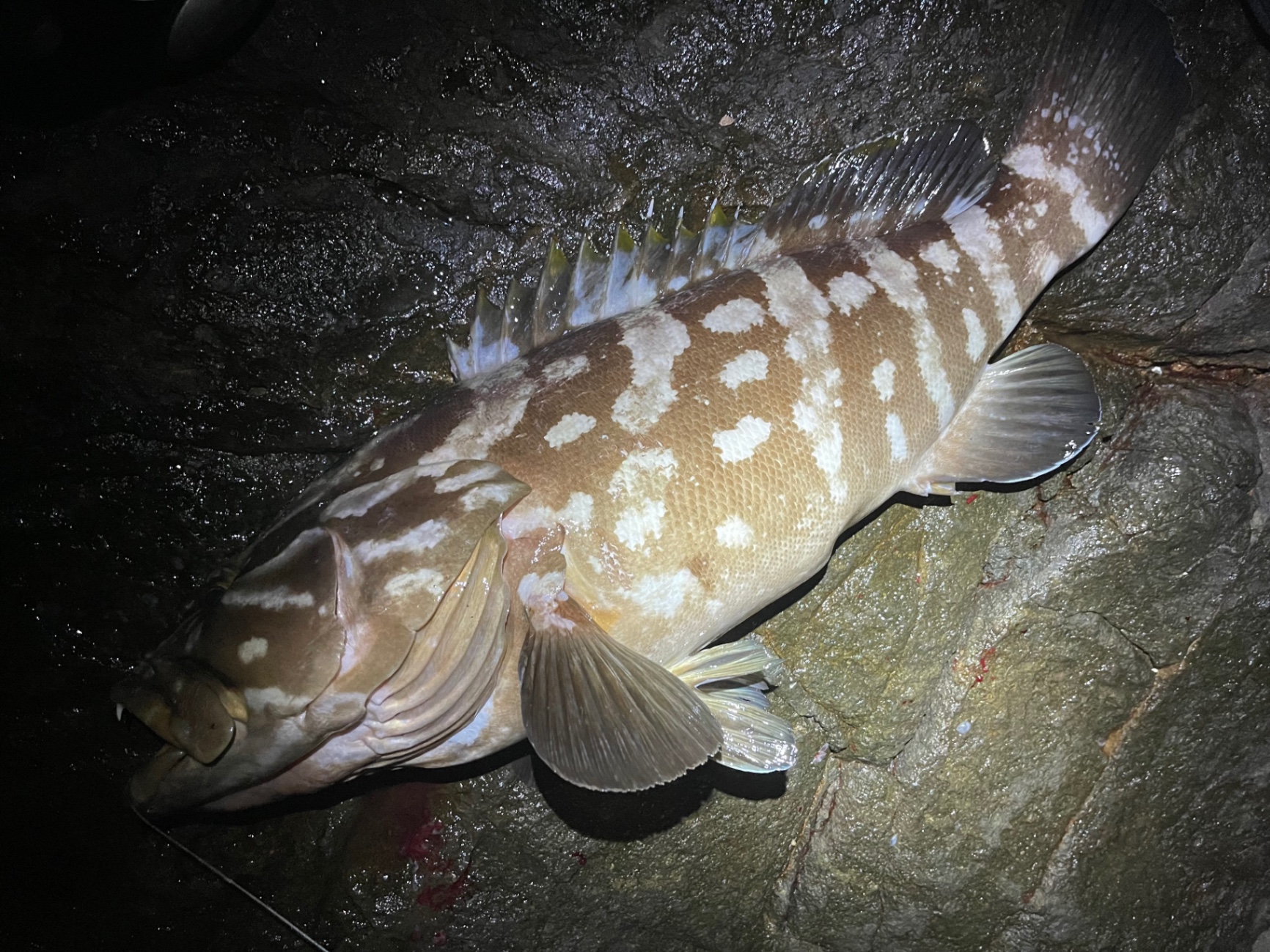23時に同行者に6キロのクエが釣れましたがその後はしばらく沈黙していましたが午前4時の干潮の潮止まりに一気に竿が突っ込みました。何度か瀬に入られましたが無事に取り込みました。久しぶりのクエは14キロの体高のある丸々した魚体でした。その後30分ぐらいで立て続けに13キロと8キロが連発して最高の秋磯シーズン開幕となりました。