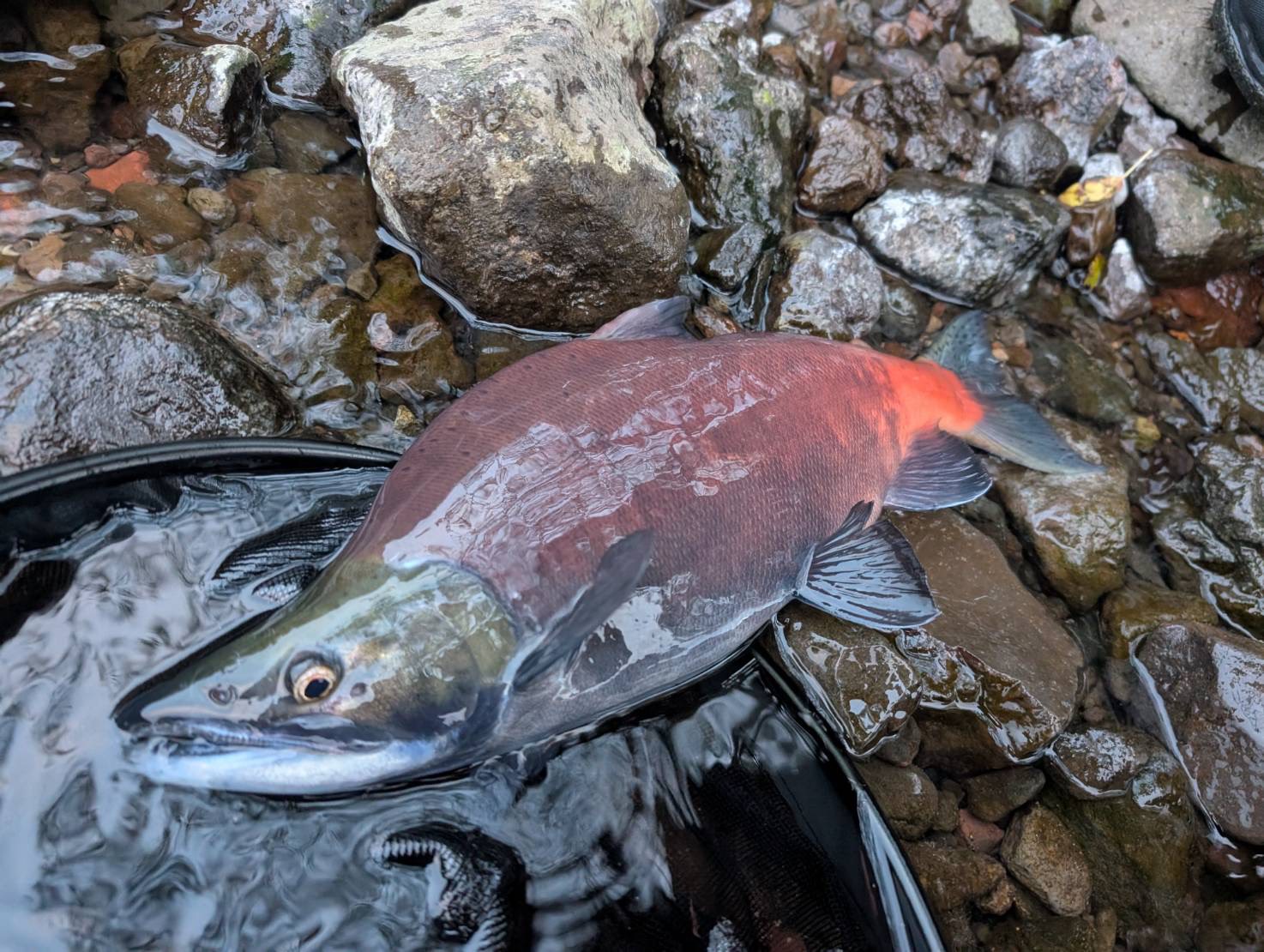 僕達は釣ったのでどうぞとポイントを譲ってくれたので竿を振る事に股ぐらまで立ちこもうとした時、石に躓き転けて左半分が水浸し状態見ていた2人は大丈夫ですかと言いながら大笑い、気を取り直しミミズを付け竿を振っていく15分位経った時に待望のアタリ合わせを入れてフッキング少しやり取りをしタモに収まったのは頭が緑で体は赤くそまり尾ビレの付根が鮮やかなオレンジに染まったその名に相応しいオスの40センチの姫鱒だった。