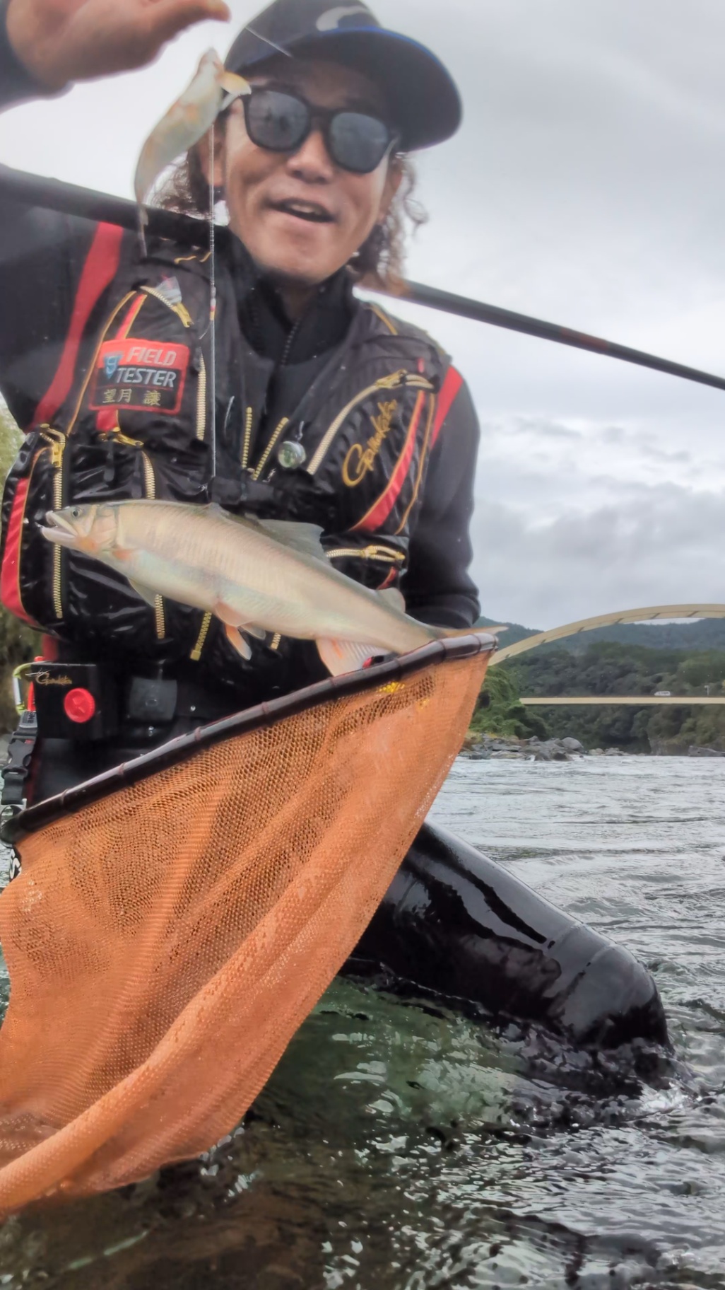 パワー系ロッド使うとどうしても真っ向勝負したくなるがPOWER Rは竿を上竿に寝かしためていればそれでオーケー、寄ってきちゃうのですごく楽に大鮎釣りが出来る。使って見る価値は充分にある竿だ。